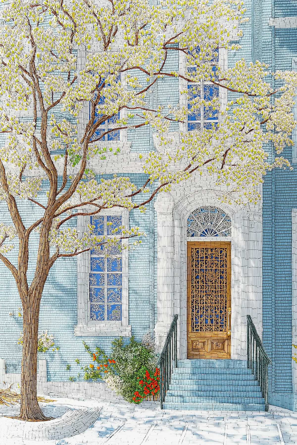 Each piece is composed using digital techniques and generative AI, which Nadler approaches as a creative collaborator rather than a directive force. This AI-assisted process enables a deep exploration of intricate details: microscopic pointillism, rhythmic linework, and layered textures. It turns facades into woven patterns, architecture into textile-like surfaces, and windows into harmonic sequences. Organic elements such as plants, stones, and sky merge seamlessly with built environments, resulting in a surreal fusion of order with wilderness, control with chaos.