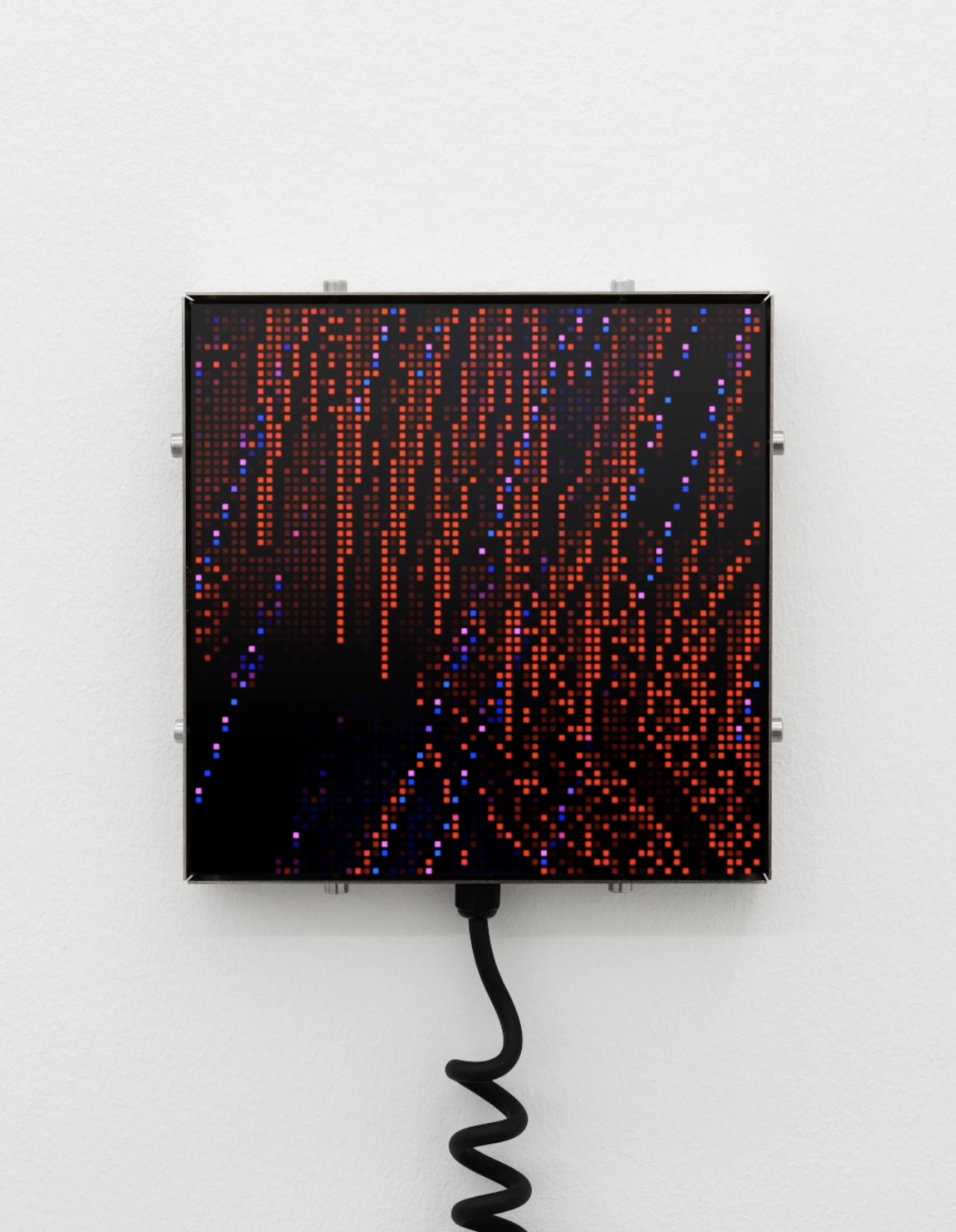 5 artworks depicting phosphorescent drops in a synthetic rainforest, presented as complete physical objects: custom handmade steel and LED screen sculptures by Spøgelsesmaskinen. Each piece includes a 20×20cm LED steel enclosure, 3-meter coiled fender guitar cable, and custom 5-volt power supply.