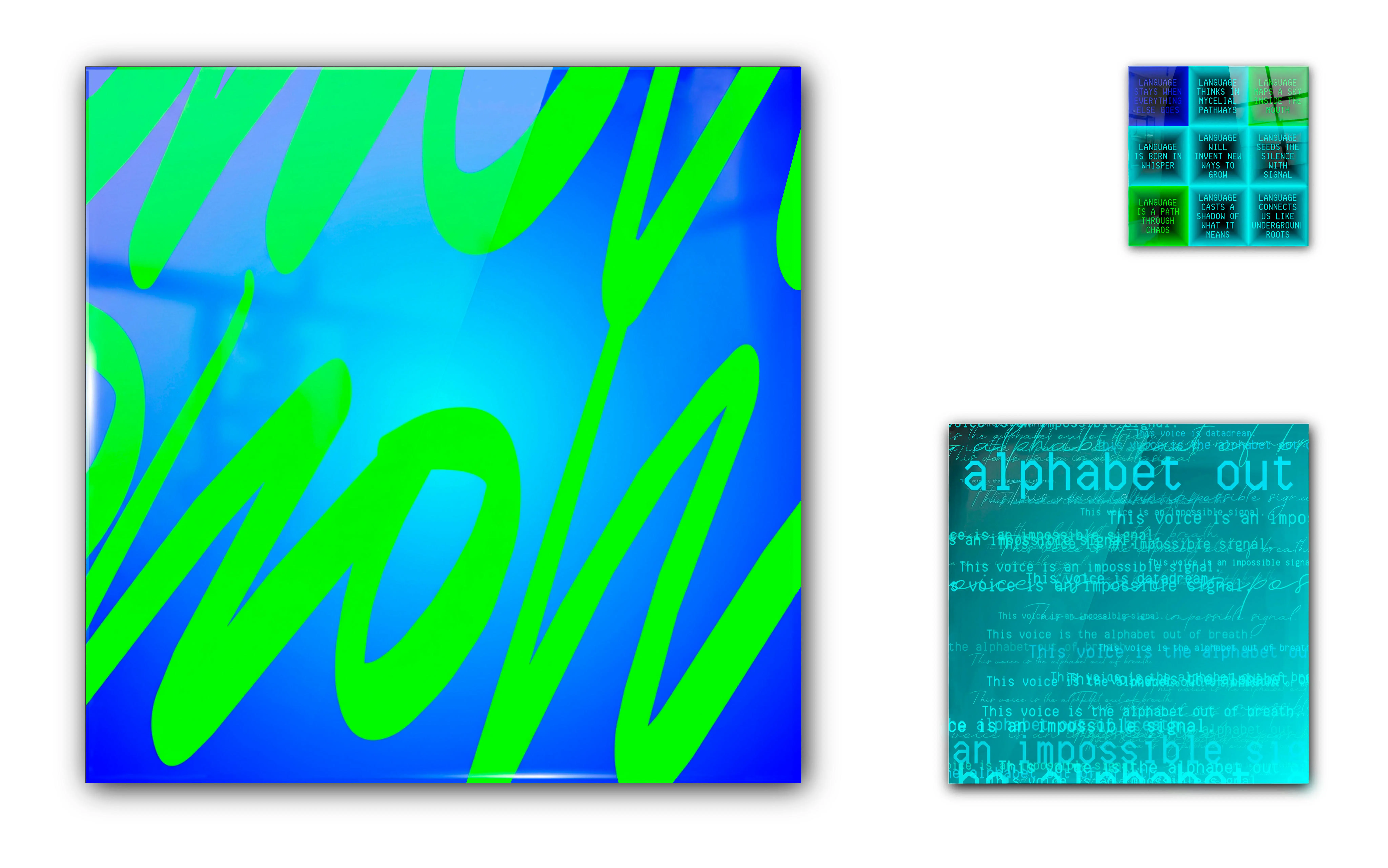 These 24 works are timestamped traces of the poem’s emergence from its genesis codebase, the original MoMA incarnation, before it began to evolve into its second life at ZKM in Germany. Unlike the live poem always unfolding in real time, I envisioned these archival acrylic-mounted fragments as offerings of stillness and focus – a meditation, or a haiku, or a mantra. Each square, glossy-faced physical is a kind of very slow, very patient, very poetic screen: a surface operating at cosmic speed, simultaneously immediate and eternal, resisting the typical cadence of our modern lives. To me, the format honors what’s essential in poetry: the capacity to slow and hold time, to let us sit and be still with an idea for as long as we want or need, revisiting and repeating it until it begins to change, and change us. The distillation of extraordinary complexity into something achingly simple. More than artifacts or outputs, these pieces are acts of attention, proof of presence, proof of readership, drawn from my personal archive."